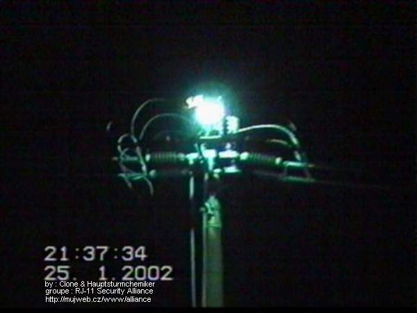 RJ-11 Security Alliance © Hauptsturmchemiker Nebudu zde popisovat okolnosti vzniku skupiny, vše je na http://mujweb.cz/www/alliance, tento dokument, který čtete se vztahuje na jednu z našich reakcí na stálé zdražování elektrické energie, občan si řekne, díky Temelínu by přeci měla být energie levnější, ale je tomu naopak energie se vesele vyváží do zahraničí a v Čechách zdražuje, proto se zaměřujeme na boj proti monopolům, jako je ČEZ a Telecom. Fotky které vidíte se vztahují na akci Mephistův plamen a jedná se o darking, kde jde v podstatě o to narušit vedení vysokého napětí, ať už přehozením vodiče přes kabely a nebo (efektivněji) zkratování úsečníku.Na akci šla část RJ-11ctky konkrétně já (Hauptsturmchemiker) a Clone, zezačátku, když jsme ještě nebyly ve skupině (cca 4 měsíce od d= 20.01.2002) jsme se specializovali spíše na chemické útoky proti hospodám a jiným kulturním zařízením, ale postupem času, jsme si řekli : ,,Co nám ti lidé udělali ?‘‘ ,,Nic!‘‘ a tak jsme se setkali se skupinou RJ-11 a přidali se k ní v boji proti monopolům, je to boj na dlouhou trať, ale my zvítězíme! Je 25. ledna, dnes je velký den, tak jsem to šel zapít, teklo to fajnově jedno pivko za druhým a než jsem se nadál bylo 19:30 a ke mně domů měl přijet Clon. ,,A kurva, dyť já nejsem doma, ale chlastám a celkem výkonně.‘‘ Volám Clonovi : ,,Přijeď sem do ×××, dopiju a jdem.‘‘ Clon přijel, dopil jsem desátou zrzku a jeli jsem ke mně pro pilku na železo a videokameru, bylo 20:00, když jsem dorazili ke mně, doma to bylo blbý, poznali těch deset kousků a moc se jim to nelíbilo ono ani na akci není dobré chodit nalitej, ale bylo už pozdě, oslavil jsem Mephista dopředu a opravdu bylo co oslavovat, vzal jsem vše potřebné a šli jsem hledat úsečník najisto, když jsem přišli na místo, kde jsem tušil, že nějáký bude, jsem uviděl krásného chlapáka s pavoukem na vrchu, ten musím udělat, šel jsem s Clonem a k němu rozhlédnu se a co nevidím o kus dál je další, to není možné dva úsečníky takový kousek vedle sebe, Bůh dal znamení, chlapci udělejte je oba! Byli dny, kdy jsem stěží našel jeden a teď toto, není to náhoda to je jasné. Byl to trochu modernější typ s pákou, která se dává do polohy zhruba 20°, je to typ jaký je na pavoucích trolejbusové dopravy, nebyl to naštěcí moderní automatický typ (viz. foto), který se zkratovat prostě nedá :(. Clone se připravil a kurva, kameru jsem nechal doma, no tak si to alespoň vyzkoušíme a kdyžtak se pro ní vrátíme, upilování zámku netrvalo déle než 2 minutky, Clon se připravil zařval : ,,Mephistův plamen‘‘ a dal páku do polohy 20°, no bylo to nádherné, (viz. foto z druhé poloviny akce) čertík vyletěl a zažnul jednu fázi, to musíme mít, to je jasné, vždyť nepodělit se o tom s ostatníma lidma by byl hřích! A tak jsem Mephista deaktivovali a odebrali se domů pro videokameru, když jsme se vrátili již plně vybaveni elektrotechnikou bylo cca 21:30, nastavuji kameru, Clon se staví pod páku a akce, vyletěl čert z elektriky a zažnul fázi, krása, Clon ještě trochu dolaďuje polohu páky, aby byl Mephistos co nejlepší, odebíráme se cca 30 metrů od rozvaděče a točím, zatím je Mephistos na jedné fázi, ale hezký. Točil jsem cca 3 minuty, když v tom přijelo auto, zastavilo a řidič kouká.,,Bacha auto, zdrhej‘‘ : říká Clon.,,Ser na to, to musím mít, lehni vole až sem dozadu nepůjde!‘‘ : odpovídám.Lehnul jsem si do pole a točil dál cca po minutě (21:34) auto odjelo, Mephistos se začínal pořádně rozpalovat, šel jsem pod rozvaděč a bral jsem to pěkně zblízka, začínal hořet, ale vždy zhasl, točil jsem to tak do 21:39, když v tom Clon zase říká : ,,Ty vole auto!‘‘ Odpovídám : ,,Ser na něj, to už tu bylo.‘‘ Tak 20 vteřin jsem stál na poli (neviděl jsem nic než Mephista). Clon : ,,Doprdele oni sem jednou, svítěj na Maphista.‘‘ Kouknu no a fakt, dvě auta (ČEZ) a jeli přímo k nám. ,,Kurva zdrhej, doprdele!!‘‘ Zdrhali jsem asi tak 200 metrů od rozvaděče, cestou, jak sem byl ještě trochu nalitej jsem ztratil baterku do videokamery, čehož jsem si všiml až když jsem se zastavili, ČEZ tam mohl být tak 20 minut. ,,To natočím.‘‘ : říkám si. Zapínám kameru, kurva to nejde, zkontroluju jí, no dohaizlu, tam nejni baterka (nová stojí 2000 Kč), nasranej ze ztráty baterky, ale hlavně z toho, že nemohu točit, mezitím totiž Mephistos zažnul druhou fázi, sice na pár vteřin, než no ČEZáci vypli, ale zažnul, bylo to krásné. Mám doma totiž novou baterku, čili by mě to zas až tak nevadilo. ČEZ odjel, jdeme se podívat na rozvaděč, cestou se koukám do pole, jestli tam náhodou někde nebude, no a fakt, byla tam, jsem jí našel. Bůh nemá rád monopol, to jsem teď už věděl 100%ně!Jinak by takto naší akci nepomohl, to je více než zřejmé.ČEZ si rozvaděč znovu zamkl a my, když už jsem měli pilku u sebe jsem si ho znovu přepilovali, abychom mohli příště udělat darking třech pavouků, při zdrhačce si totiž Clone všimnul, že v poli je další pavouk, čili již třetí, Bože buď pochválen, z akce jsme odcházeli plně uspokojeni, vždyť na to, že to byl náš první úspěšný darking byl vydařený. Druhý den jsem zjistil, že naše akce způsobila přetrhávané výpadky elektrické energie trvající cca 25 minut v celé čtvrti (cca 1500 občanů), proto ČEZ reagoval takto rychle a hlavně Mephistos byl vidět všude (viz. fotky).